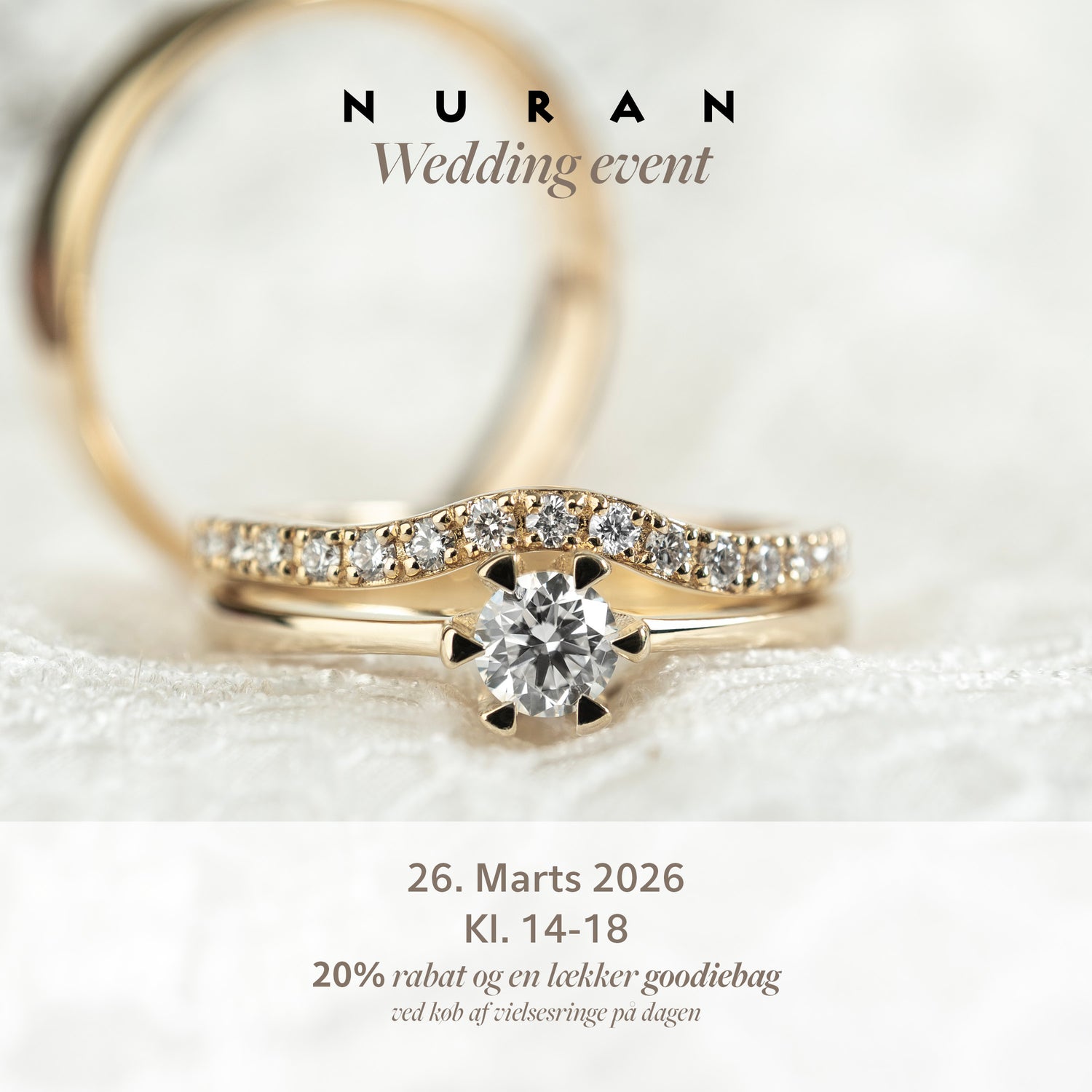 D. 26. marts fremviser vi, i samarbejde med Anette fra Nuran, hele deres store udvalg af vielsesringe, og hjælper jer med at sætte jeres eget præg på designet.