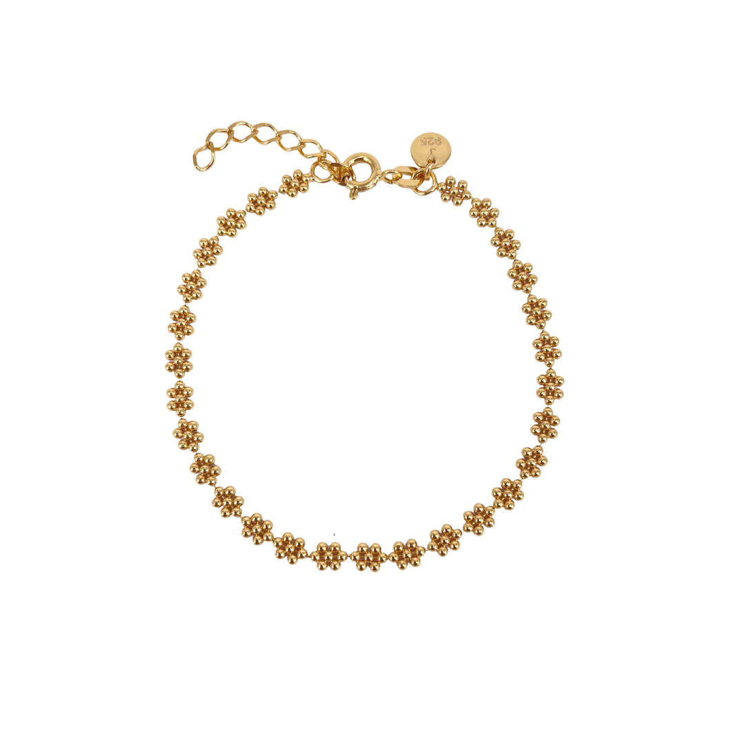 Aqua Dulce Lots Of Flowers armbånd er i forgyldt sterlingsølv og har vakre blomsterdetaljer. Længden er 17 cm med en ekstra 3 cm for justering.