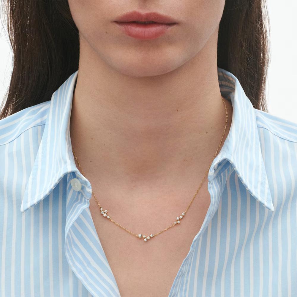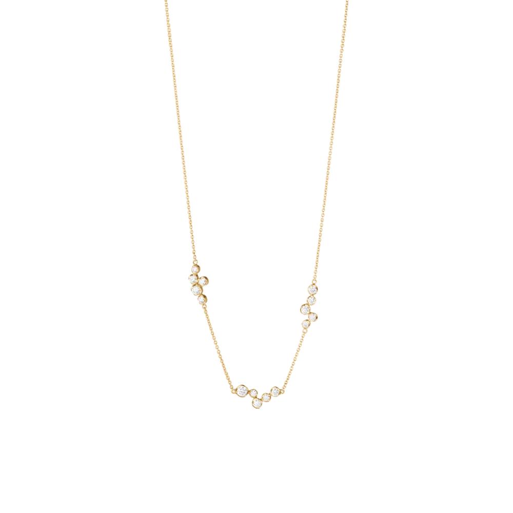 Den enkle og elegante Georg Jensen Signature Diamonds halskæde er designet til at passe til både hverdag og særlige anledninger. Smykket er udført i 18 kt. guld og besat med klynger af brilliantslebne diamanter, der på legende vis er spredt rundt omkring på kæden. Diamanterne er arrangeret i Georg Jensens signaturfatning, som får dem til at funkle maksimalt.