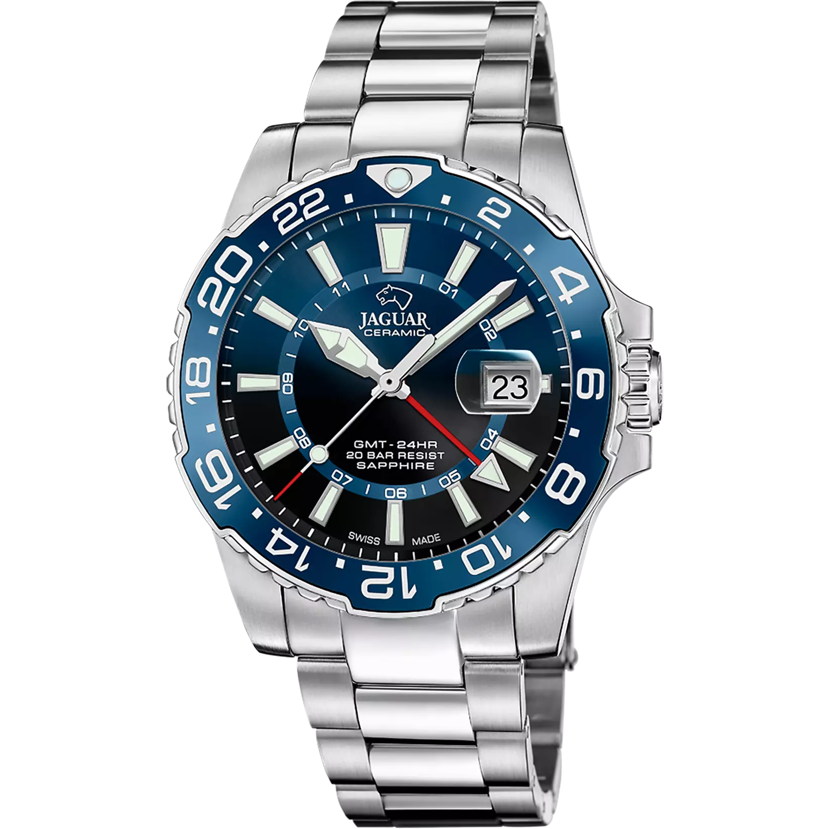 Jaguar Ceramic GMT J1011/2 er et elegant og funktionelt herreur med robust Swiss Made quartzværk, GMT-funktion til to tidszoner og safirglas. Med keramisk krans, blå urskive og 200 meters vandtæthed kombinerer uret stil, præcision og holdbarhed – perfekt til både rejser og hverdag.