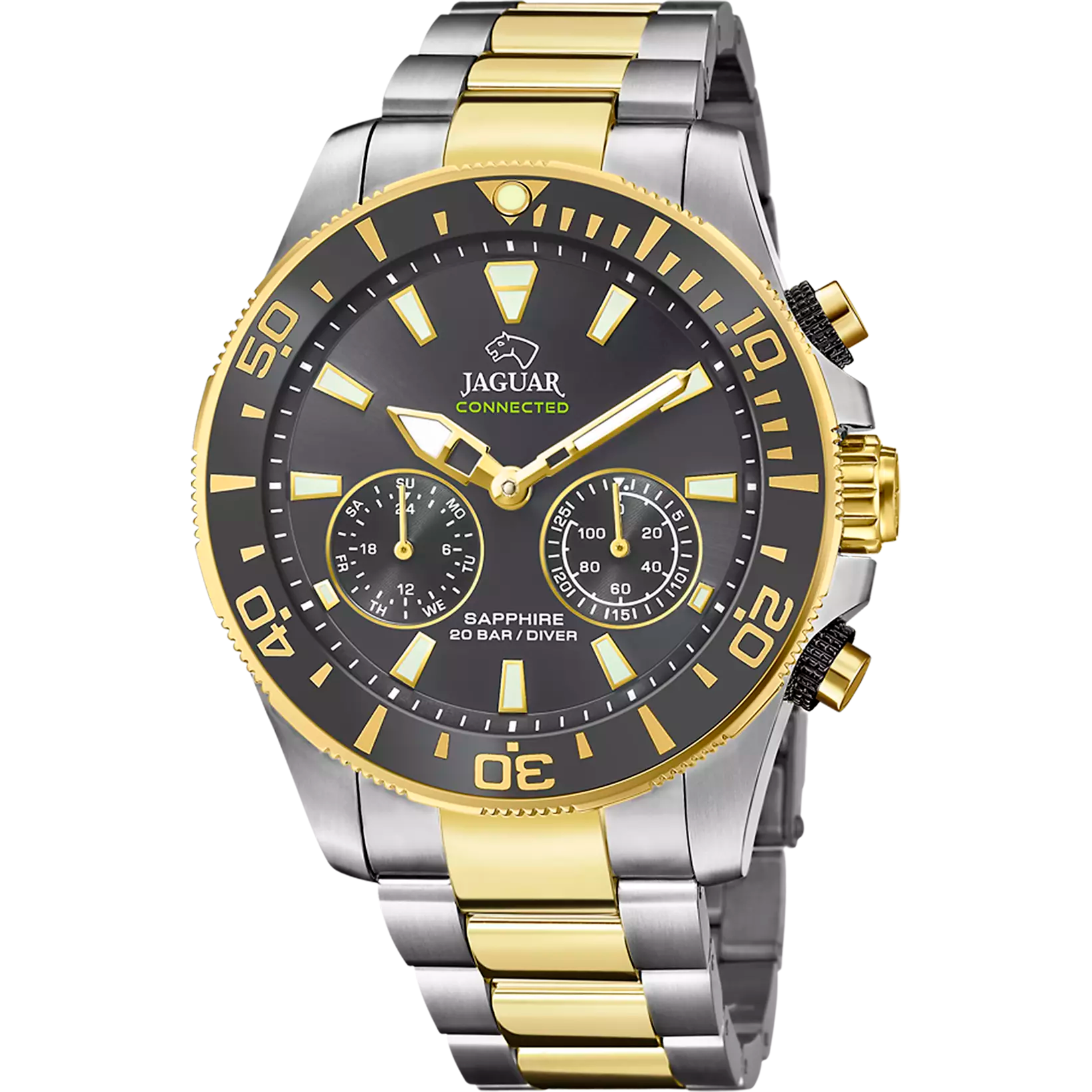 Jaguar Connected Diver J889/4 kombinerer Swiss Made præcision med moderne smart-funktioner. Den grå urskive og bicolor-lænke giver uret et maskulint og stilfuldt udtryk, mens safirglas og 200 meters vandtæthed sikrer robusthed til både hverdag og dykning.