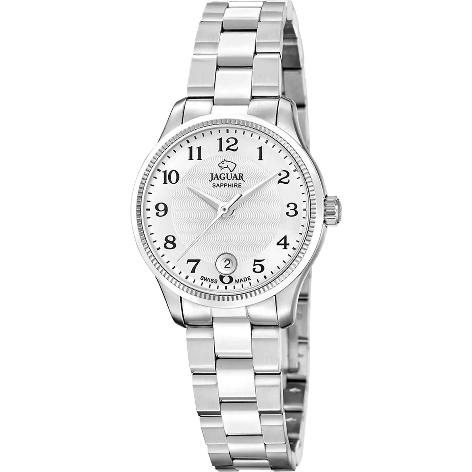 Jaguar D. Acamar Classic J1045/1 er et elegant dameur med Swiss Made quartzværk og safirglas. Den hvide urskive og stållænke giver uret et klassisk og tidløst udtryk, perfekt til både hverdag og festlige lejligheder.