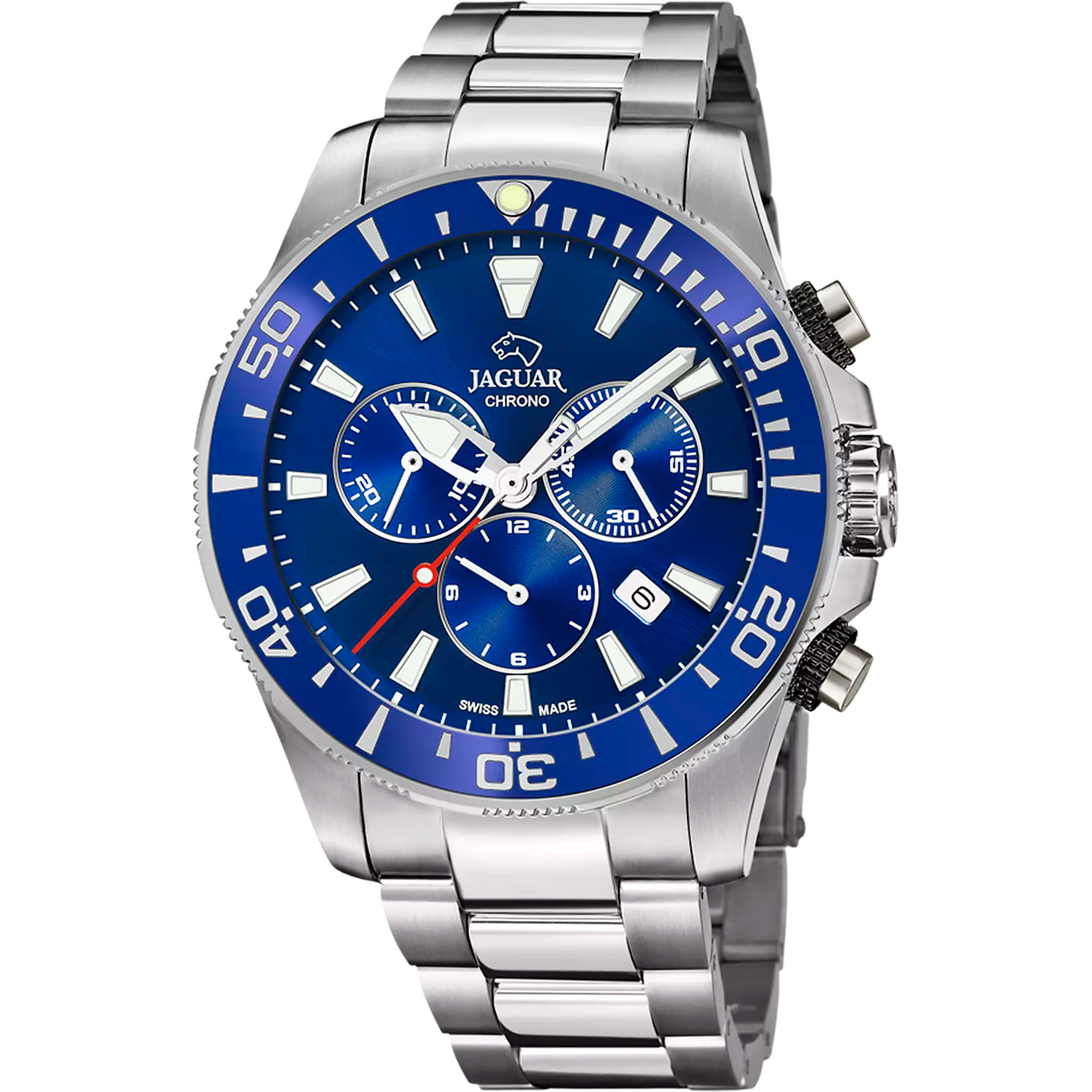 Jaguar H. Chronograf J861/2 er et kraftfuldt og stilfuldt herreur med Swiss Made kronografværk og safirglas. Den blå urskive og stållænke giver uret et elegant, men sporty udtryk, perfekt til både hverdag og aktive eventyr, med vandtæthed op til 200 meter.