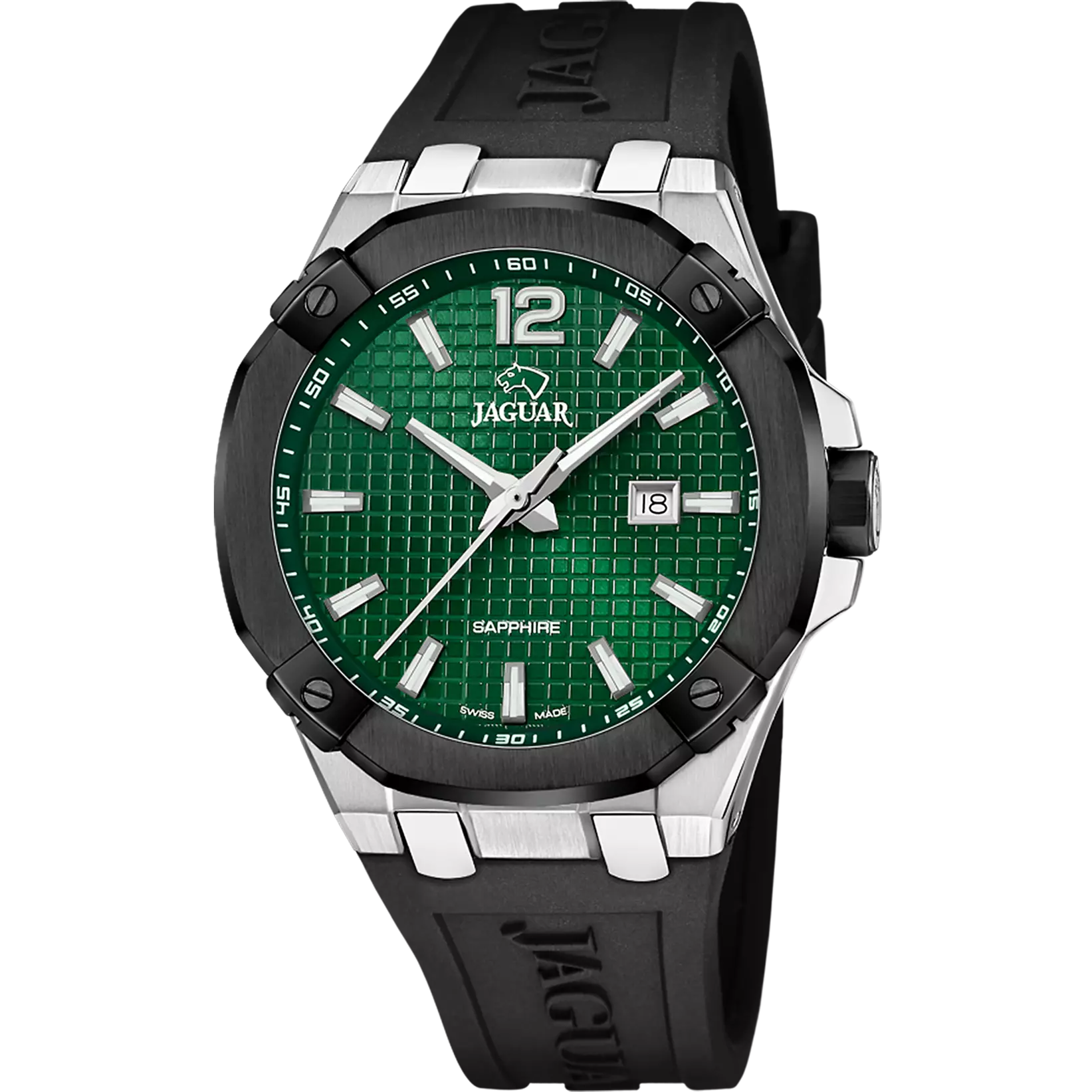 Jaguar H. Diplomatic J1019/1 er et elegant herreur med Swiss Made quartzværk, safirglas og 100 m vandtæthed. Den grønne urskive og sorte rem giver uret et stilfuldt og moderne look, velegnet til både hverdag og formelle lejligheder.