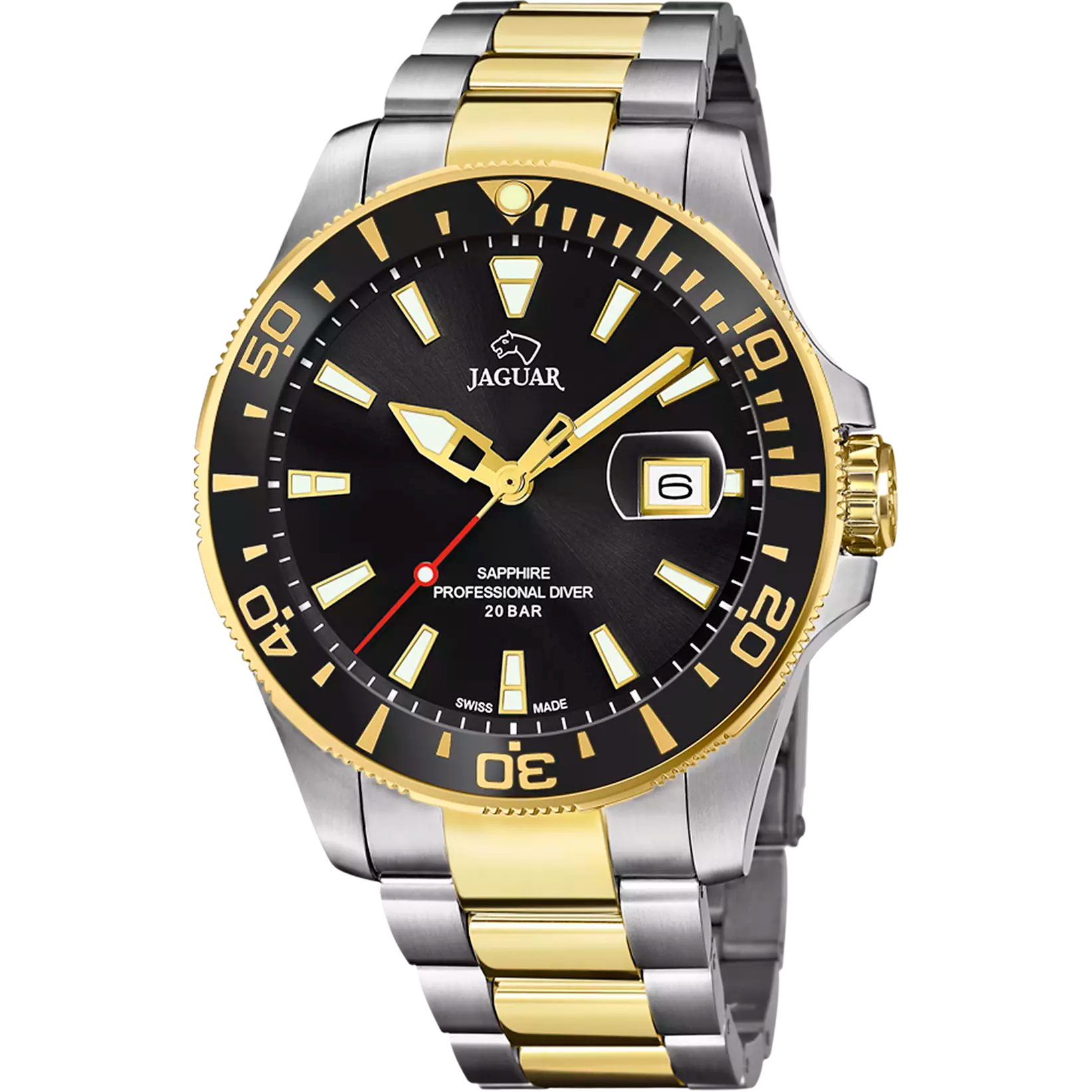 Jaguar H. Pro. Diver J863/D er et sporty og robust herreur med Swiss Made quartzværk og safirglas. Den sorte urskive kombineret med bicolor-lænke giver uret et elegant og maskulint udtryk, med vandtæthed op til 200 meter, perfekt til både dykning og daglig brug.