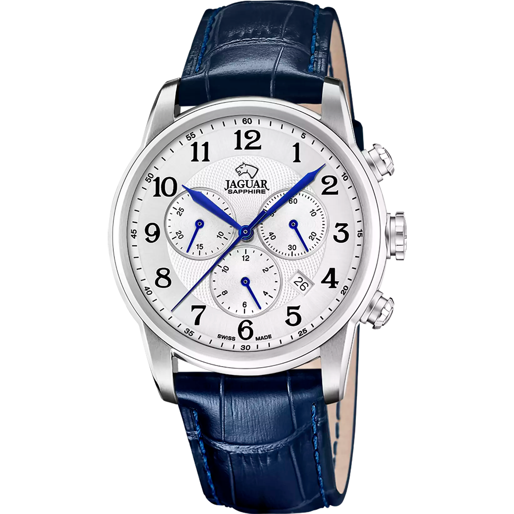Jaguar Acamar Chronographe J968/4 er et sporty og elegant herreur med Swiss Made kronografværk og safirglas. Den sølvfarvede urskive kombineret med stållænke giver uret et klassisk og tidløst udtryk, ideelt til både hverdag og formelle anledninger.