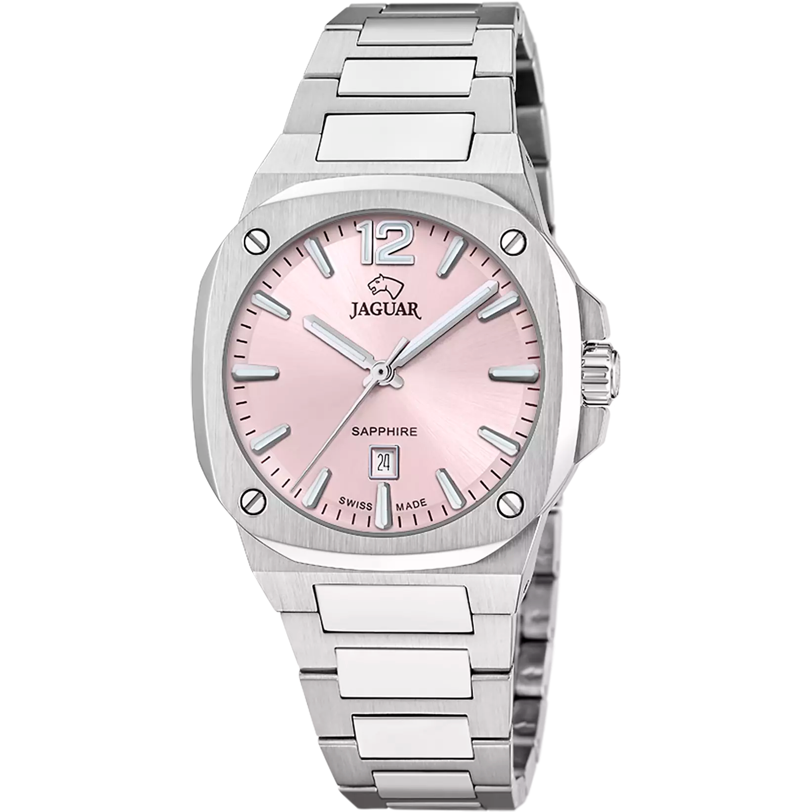 Jaguar Rondcarre J1027/3 er et elegant dameur med Swiss Made quartzværk, safirglas og 100 m vandtæthed. Den lyserøde urskive giver uret et feminint og moderne udtryk, kombineret med en klassisk stållænke, der passer perfekt til både hverdag og festlige lejligheder.