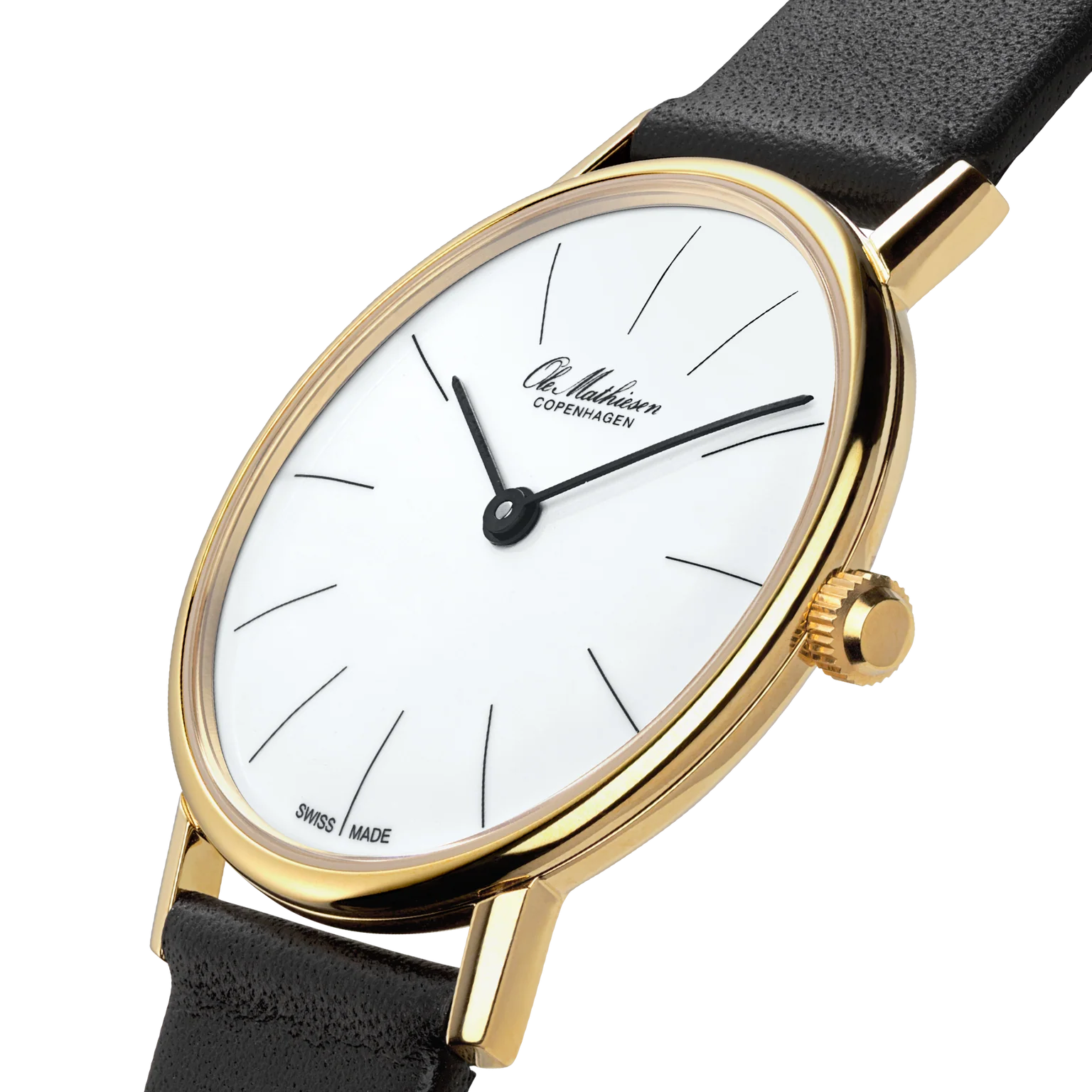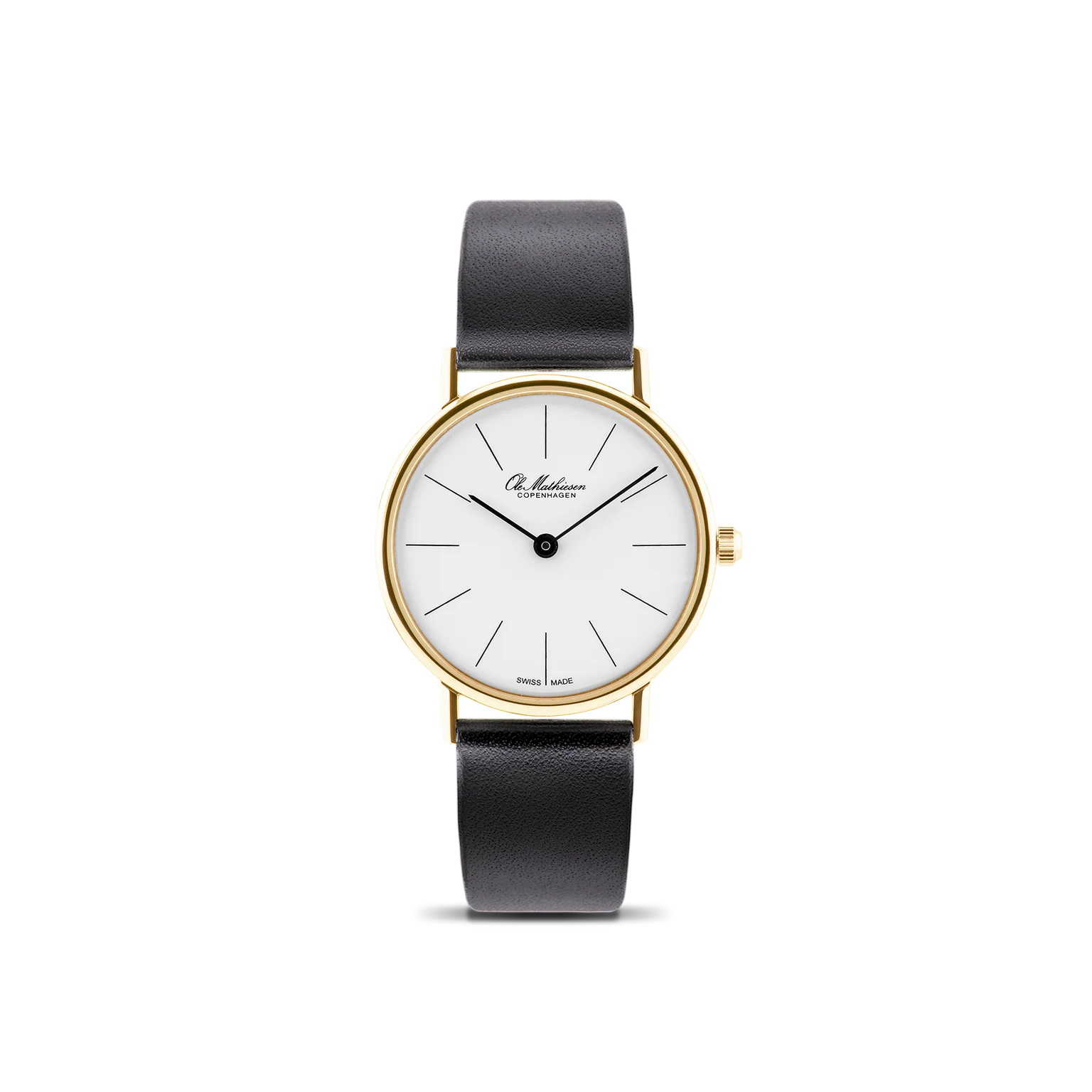 Ole Mathiesen 1962 Classic 28 er et elegant ur med hvid urskive og linjeindeks, guldbelagt stålkasse, schweizisk kvartsurværk og sort læderrem.