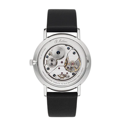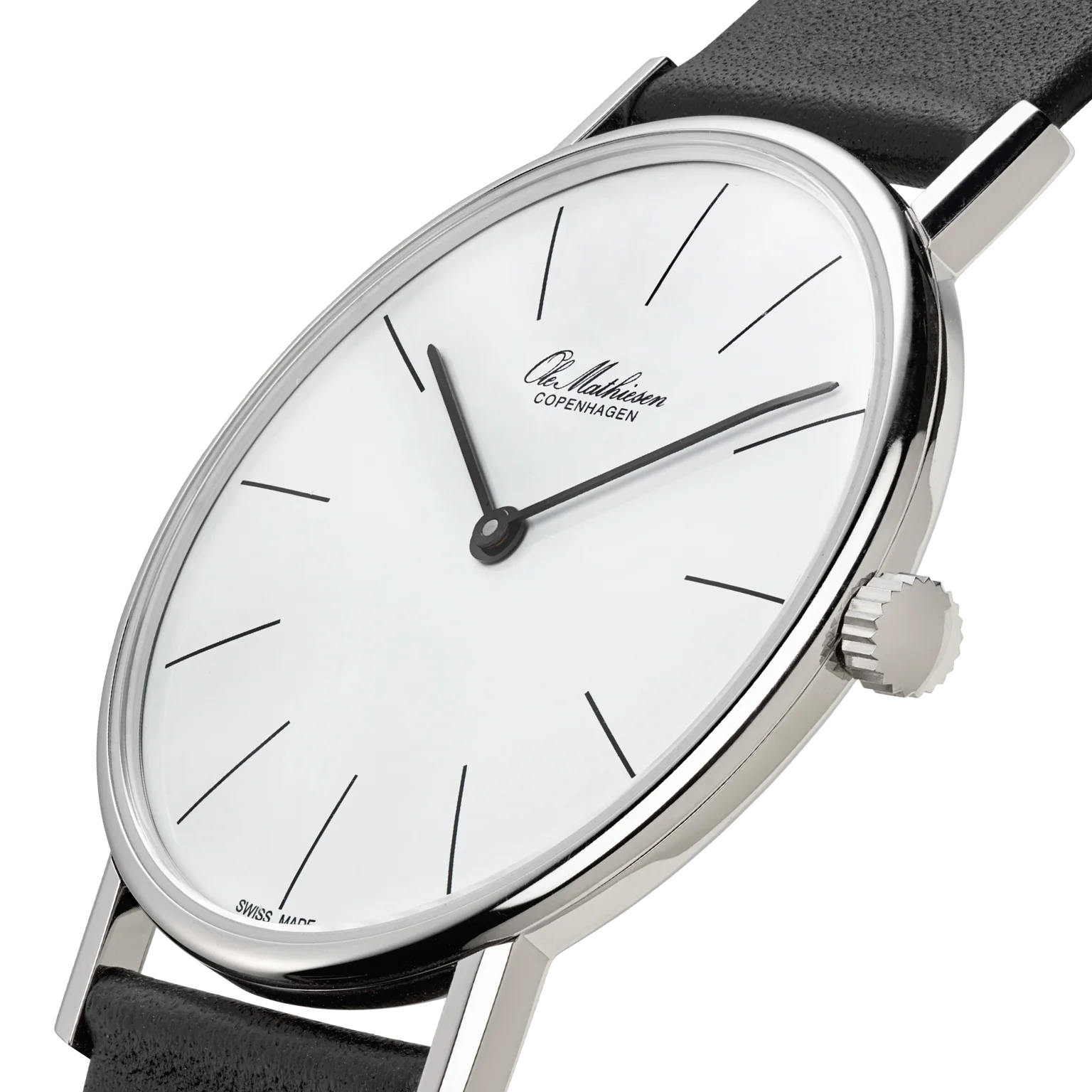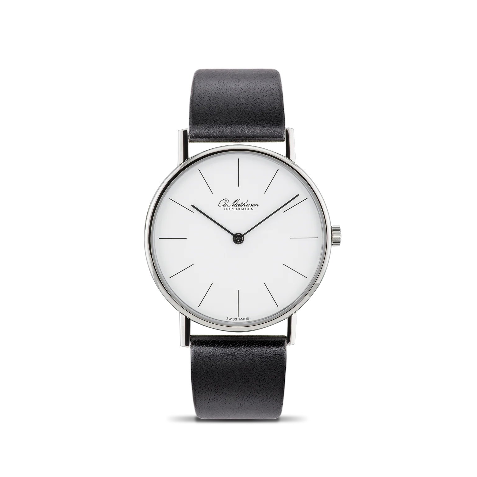 Ole Mathiesen 1962 Classic 35 er et elegant ur med hvid urskive og linjeindeks, slank stålkasse, schweizisk kvartsurværk og sort læderrem.