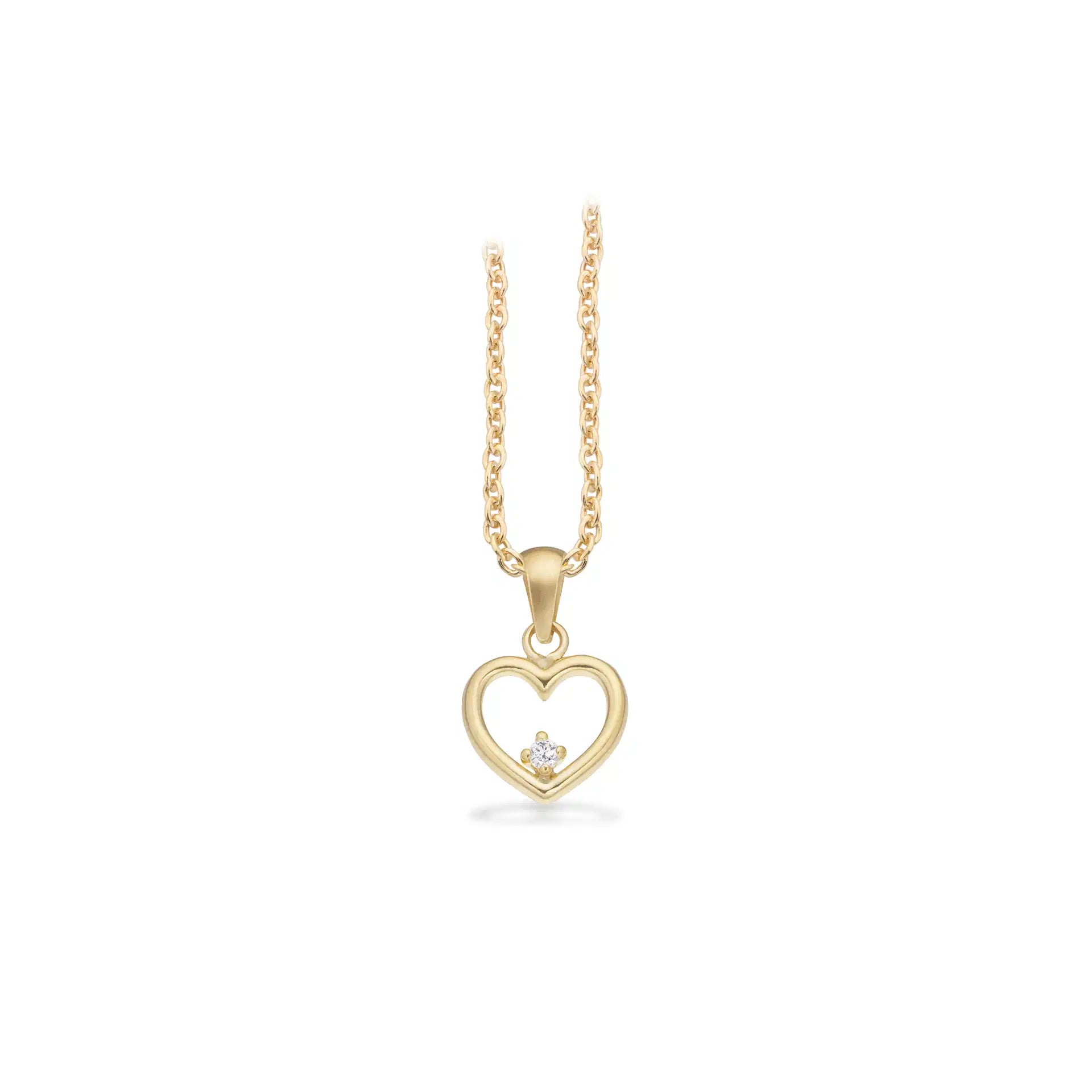 Et elegant hjerteformet vedhæng i 8 karat guld, smukt besat med funklende cubic zirkonia. Vedhænget leveres med en fin sølvkæde – et tidløst og romantisk smykke, perfekt som gave eller til personlig forkælelse.