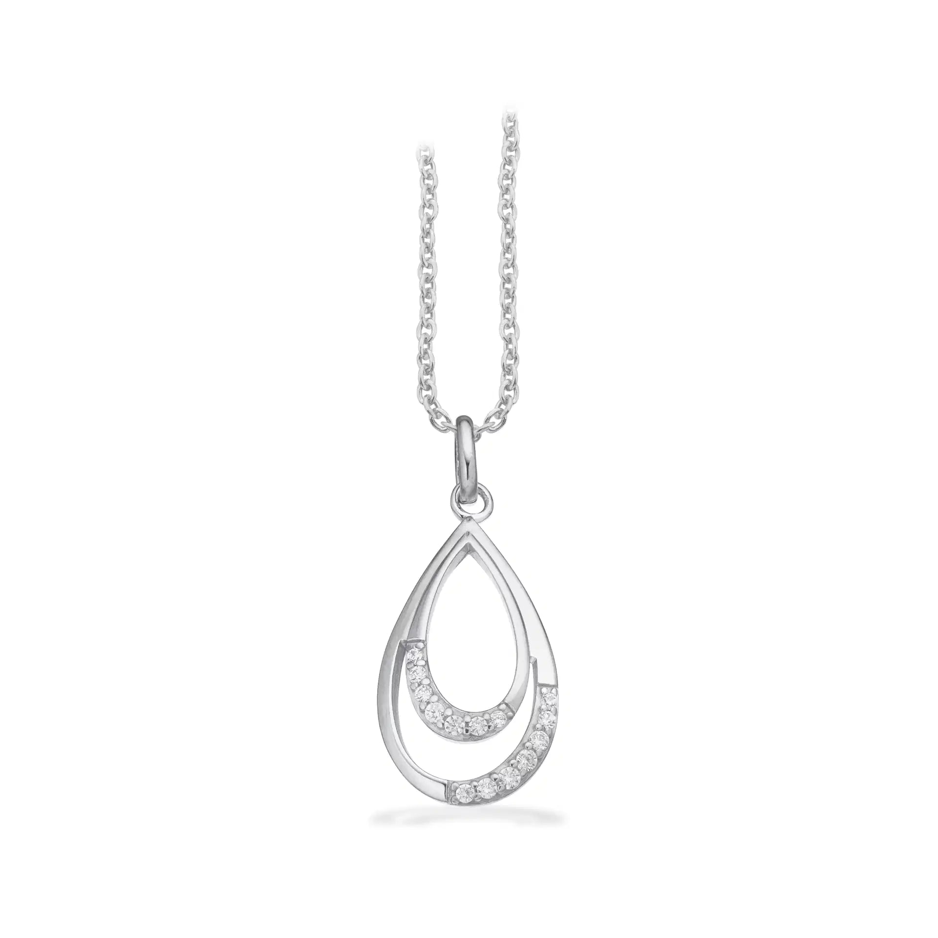 Elegant ovalt vedhæng i rhodineret sølv, pyntet med funklende cubic zirkonia og leveret med matchende kæde. Et stilfuldt og tidløst smykke til enhver anledning.