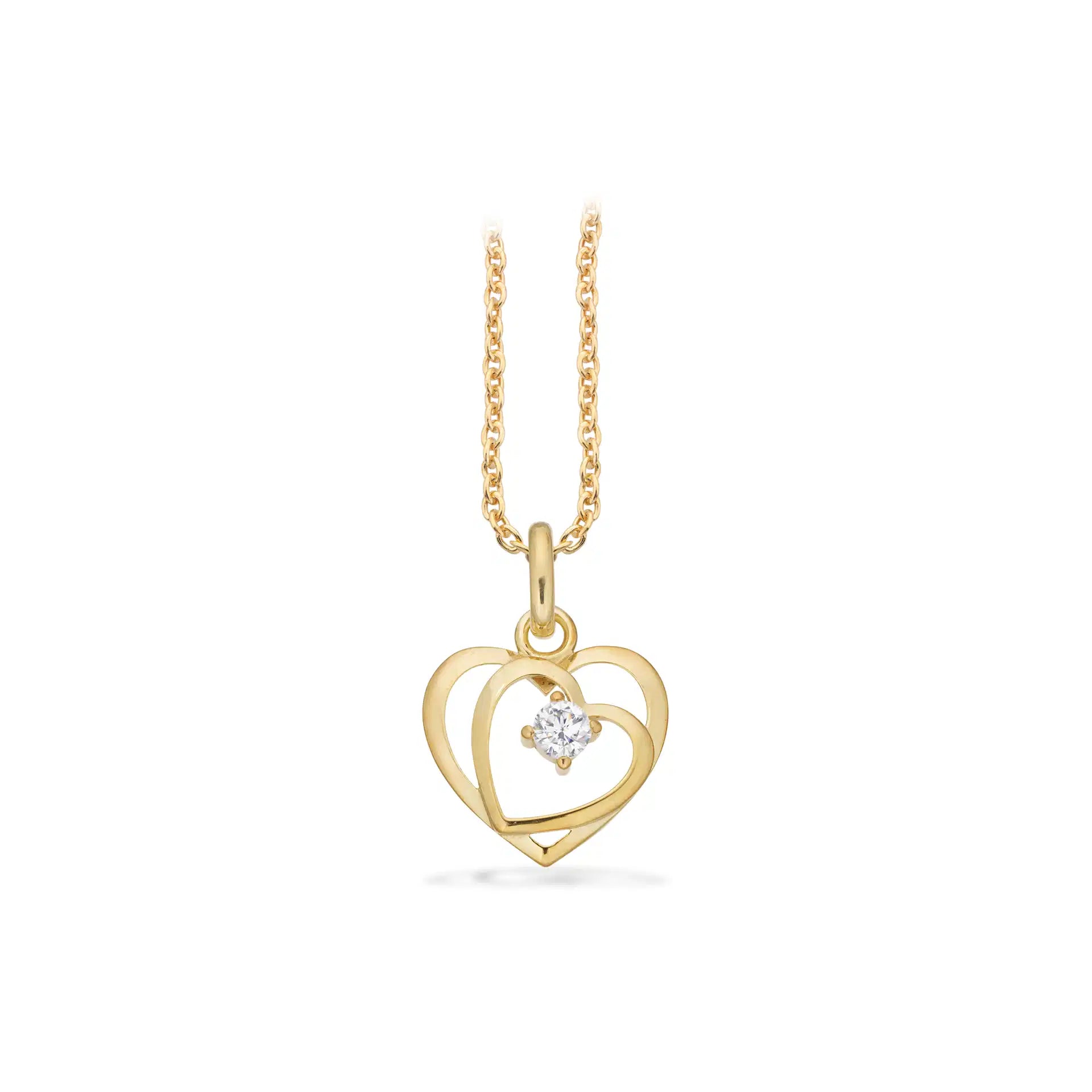 Et smukt hjertevedhæng i 8 karat guld, udsmykket med glitrende cubic zirkonia-sten og leveret med en elegant sølvkæde. Et romantisk og tidløst smykke, der passer til enhver anledning.