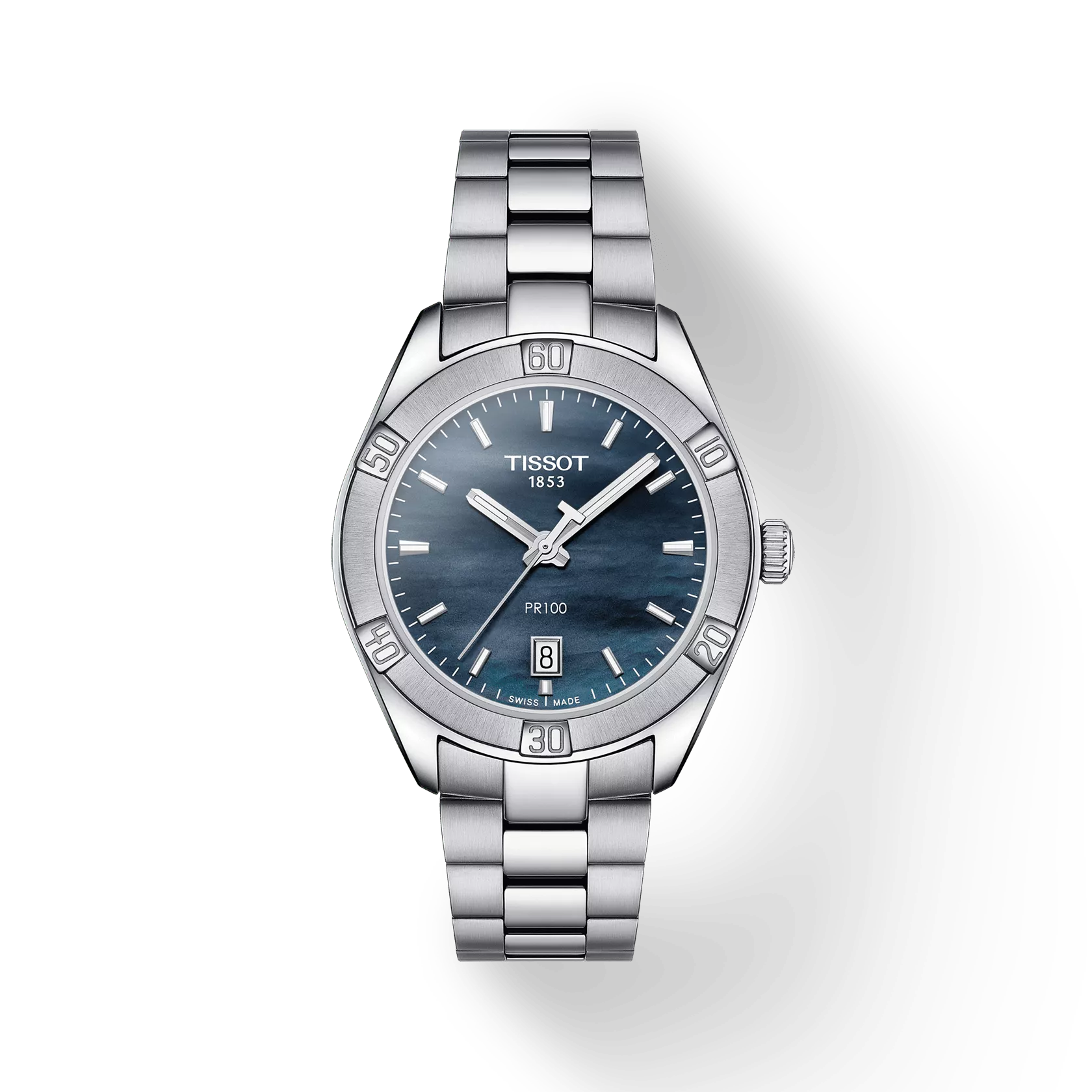 Tissot PR 100 Sport Chic kombinerer sporty elegance med en unik perlemorsskive og pålidelig schweizisk quartzteknologi – beskyttet af safirglas med antirefleksbehandling.