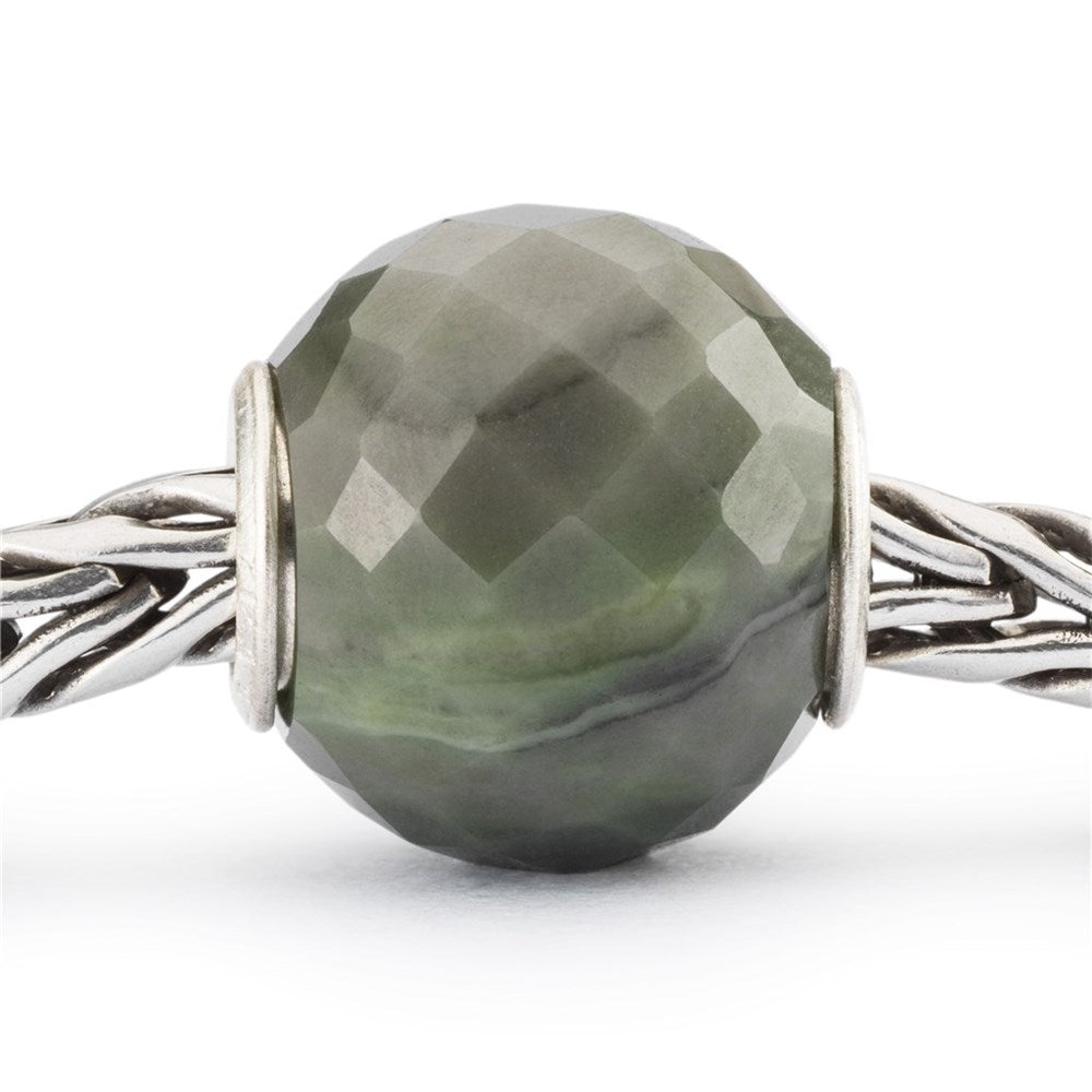 Round faceted stone of Green Calcite with a sterling silver lining.